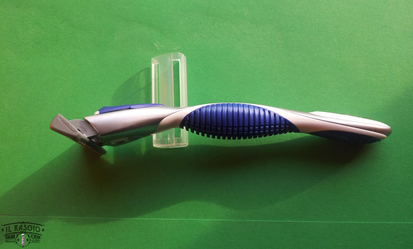 L'impugnatura risulta essere molto confortevole grazie alla silhouette ergonomica e alle parti in gomma. Queste ultime sono state posizionate in modo da permettere una agevole impugnatura sia arretrata (tre dita sul finale del manico) sia con impugnatura più avanzata (a 4 dita) lungo il manico. Risulta essere ben equilibrato per l'uso a cui è deputato il rasoio, infatti il punto di equilibrio è sbilanciato oltre la parte mediana del manico, verso la testina.