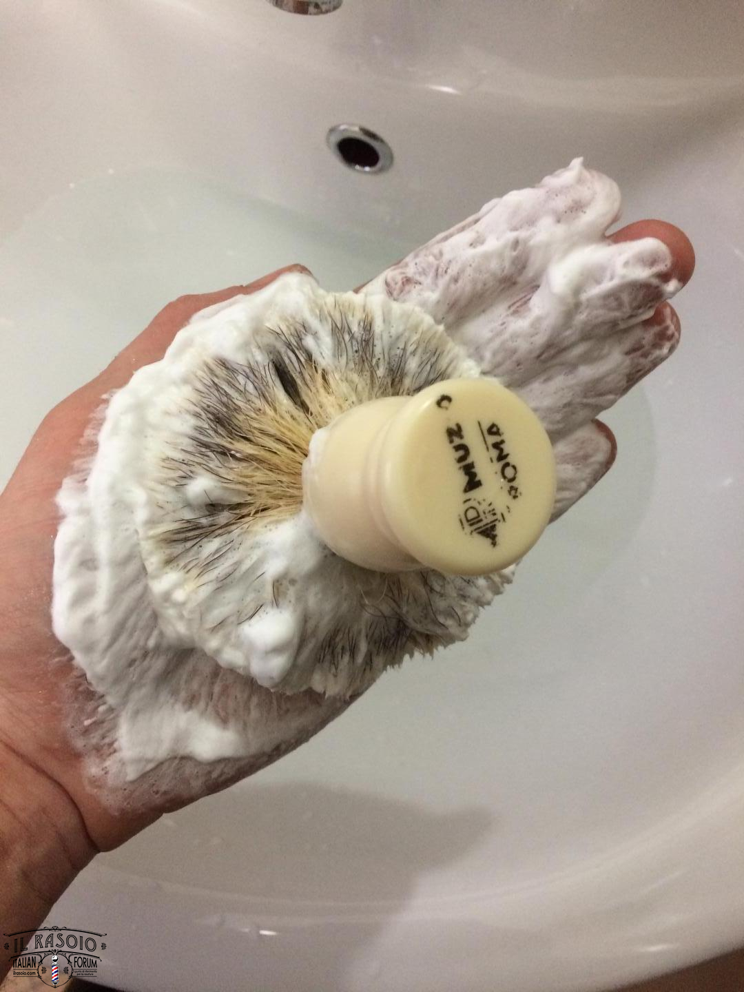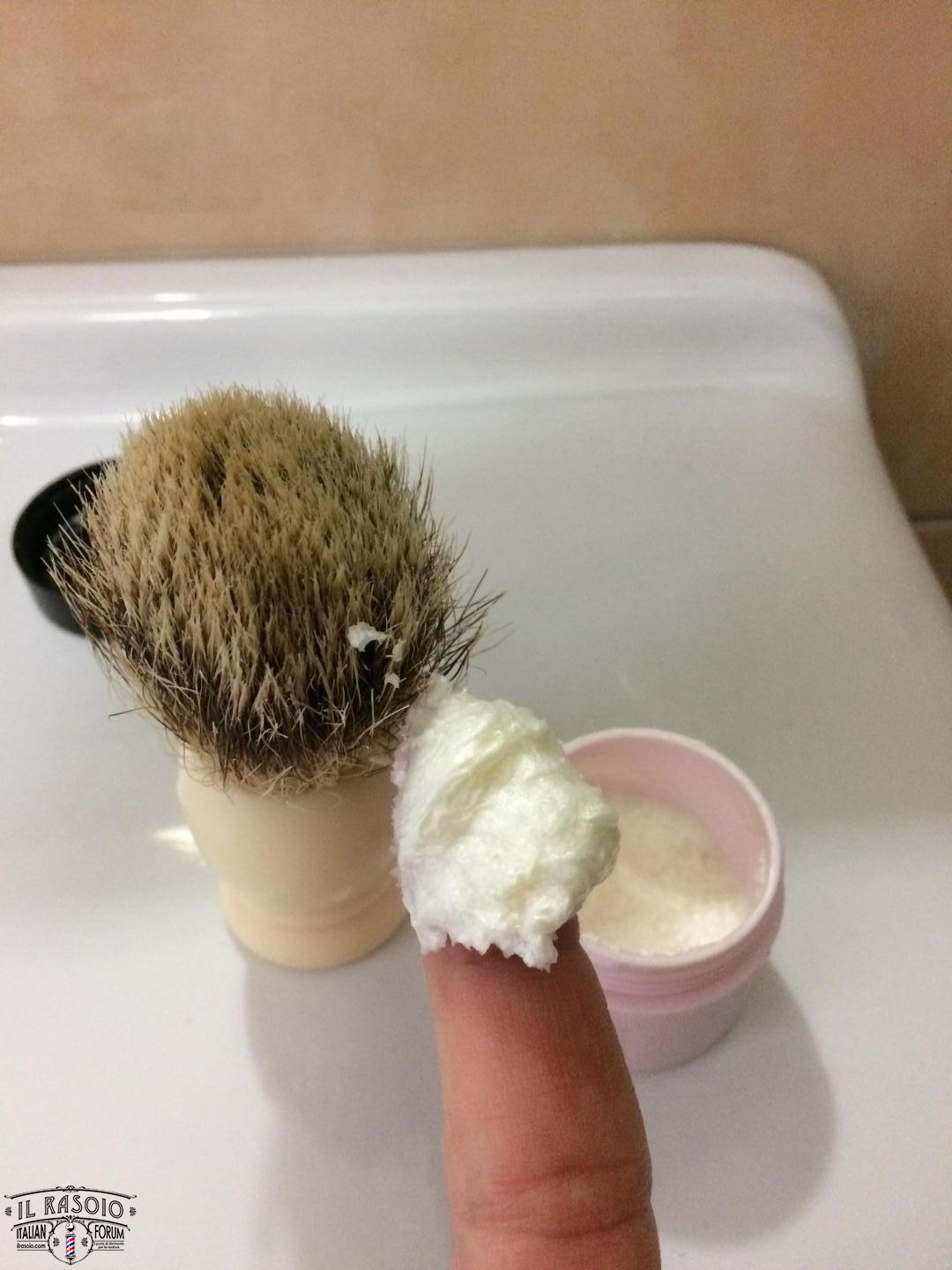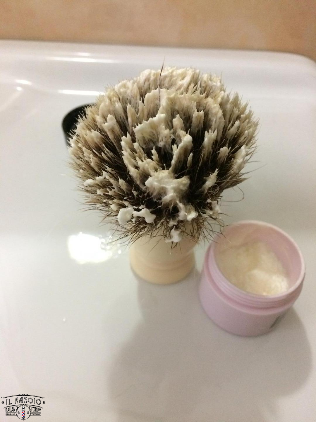 2. con le dita distribuisco uniformemente la crema fra le setole e poi inizio ad insaponarmi in HL, FL o BL (fate voi) aggiungendo almeno 3 volte qualche goccia d’acqua.