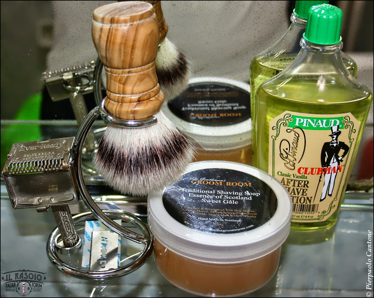 The Gentleman's Groom Room Essence of Scotland Sweet Gale • Frank Shaving Pur-Tech Synth 4gen Bethlhem Olive Wood 26x54x114 • Ever Ready 1930 • Feather SE FHS-5 Hi-Stainless Platinum & PTFE Coated #11 • Clubman Pinaud Vanilla Classic