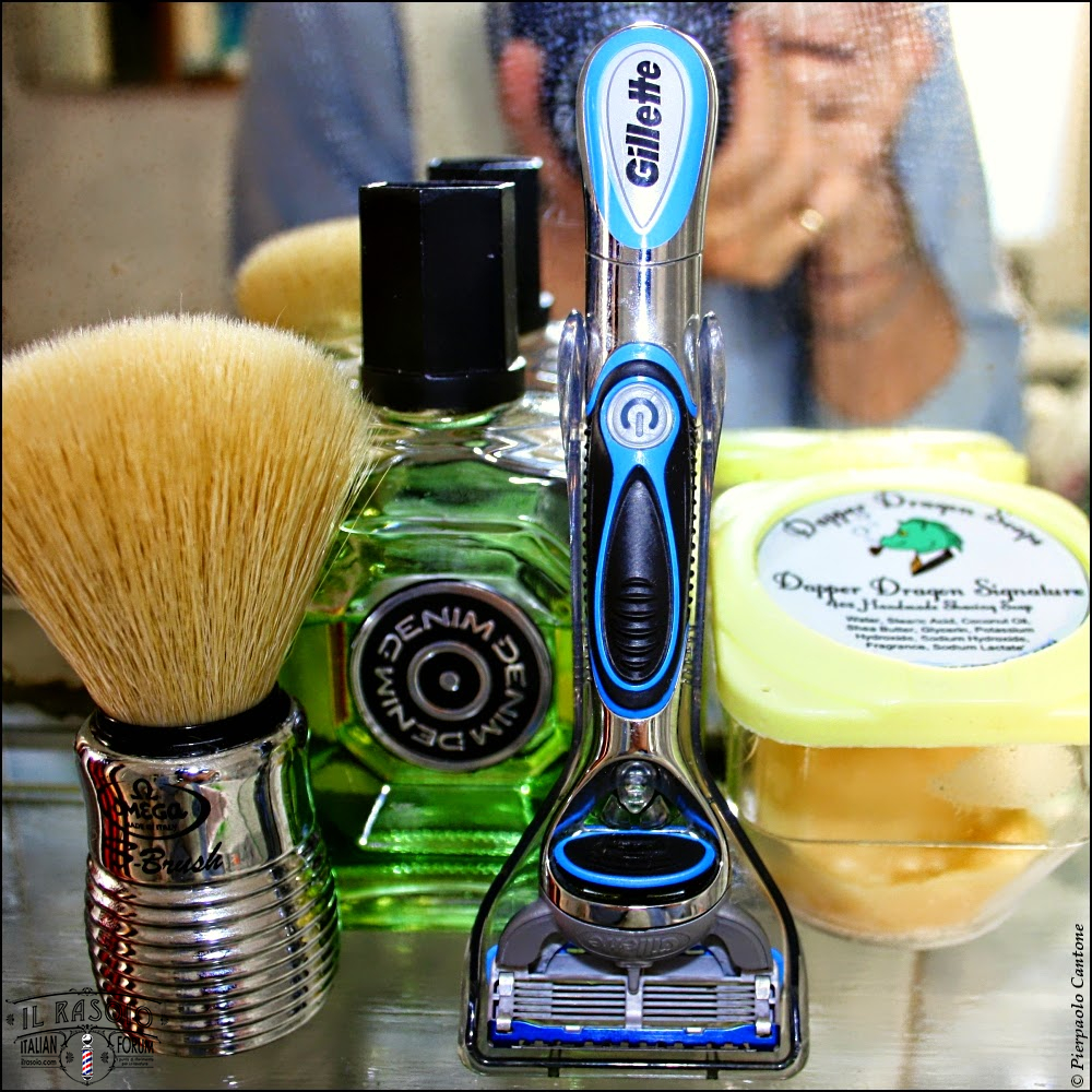 Dapper Dragon Signature (sample, repack) • Omega S-Brush Beehive S10081 24x55x105mm • Gillette Fusion ProGlide Power with Multi5 GFPGP5 #144 • Demin Musk After Shave Lotion
