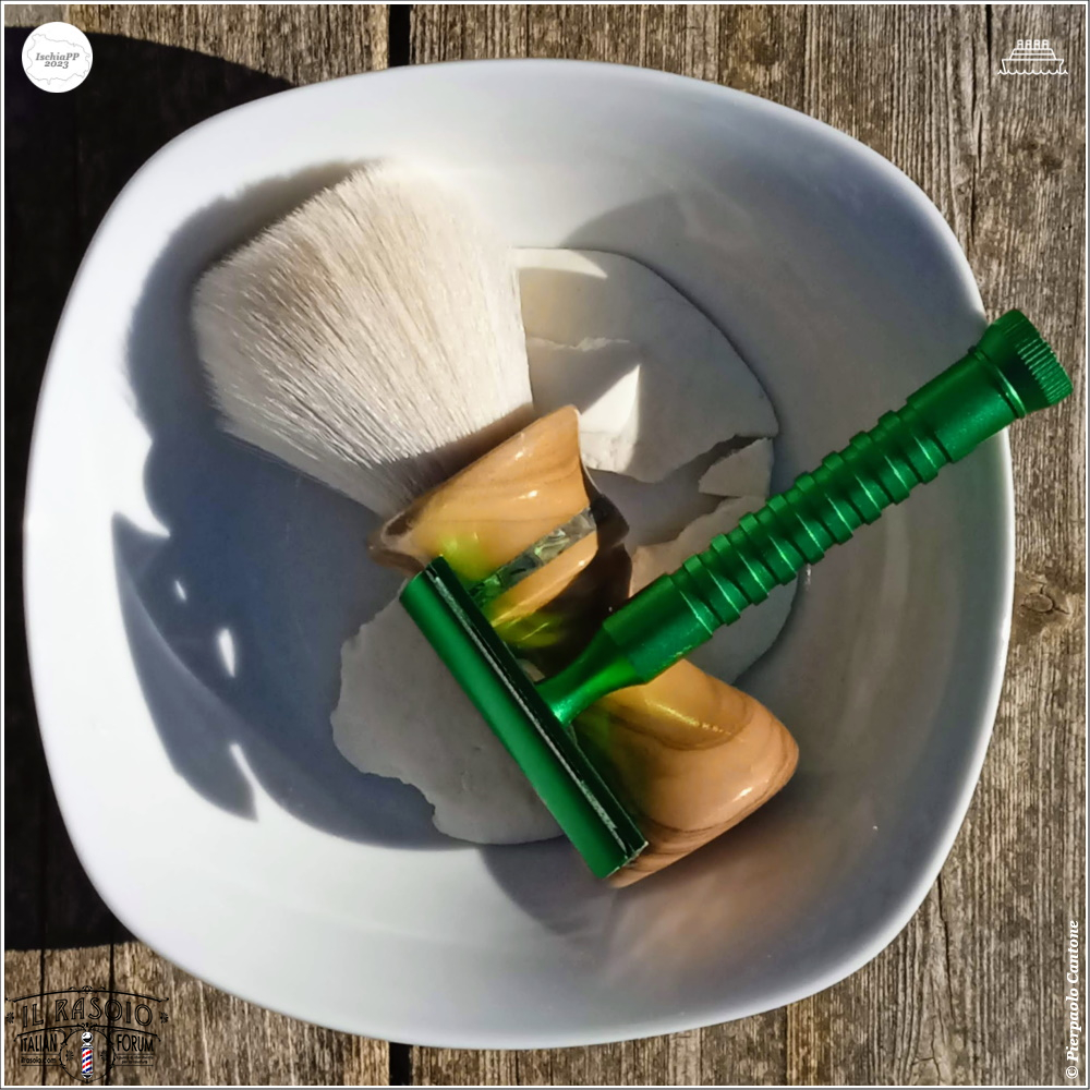 - Brush: Bat71 Cashmere Olive Wood, Abalone Shell Inlay, Yaqi SK07 aka Maggard Beige, 24x50x115mm