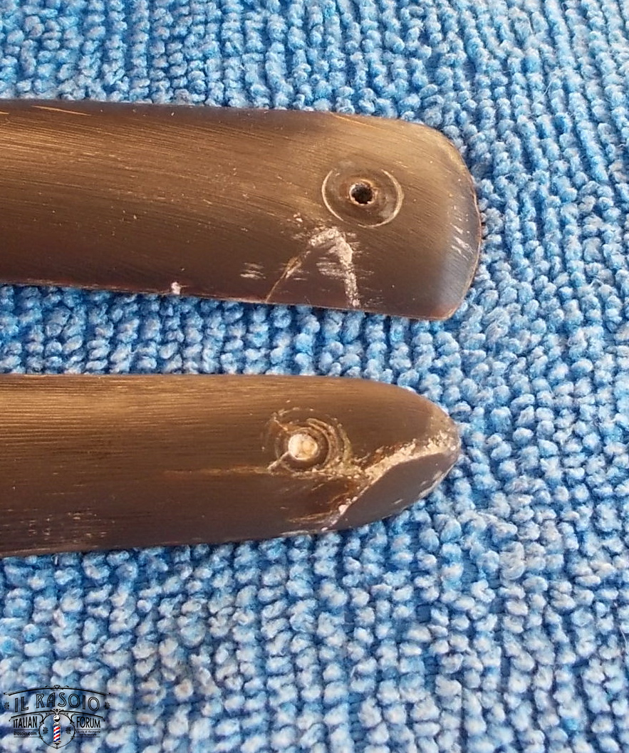 La protesi sul pivot è stata realizzata con un "incastro a mezzo legno" che prende anche il pivot (e quindi la relativa rondella interna) in modo da garantire la tenuta della parte riportata. Già che c'ero con polvere di corno e cianoacrilato gel riempivo anche le "carie" interne del manico.