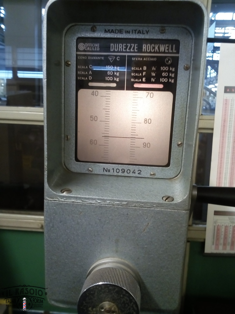 Test di durezza: Durezza Media 55 HRC. Il minimo pensabile per un rasoio. Un MA5M ben temprato può raggiungere comunque, a causa della poca quantità di carbonio, circa i 60 HRC.