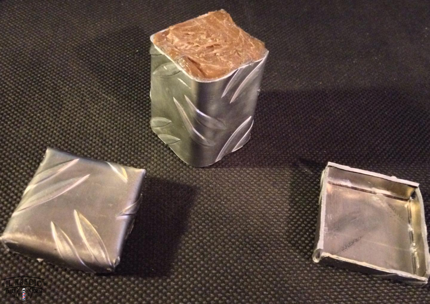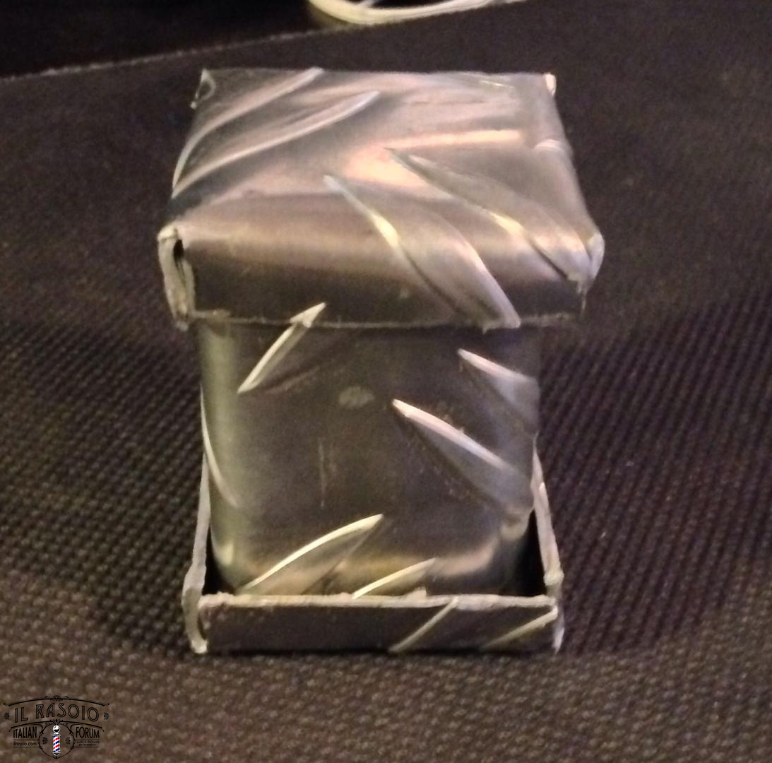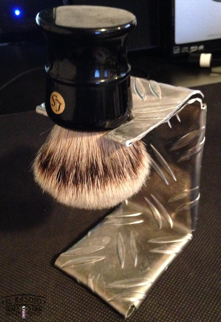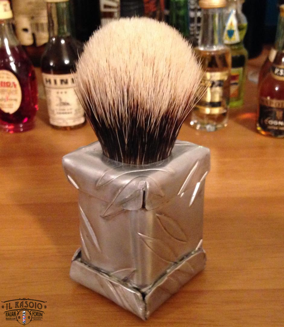 Ho in produzione l'analogo pennello. Ciuffo finest 2band da 24mm in arrivo dalla cina, son partito da una banale asta di legno con sezione quadrata di 35mm per lato tagliato alto 5cm. Rivestito di alluminio risato in maniera non troppo precisa e riempita l'intersezione di silicone per evitare mi marcisca il legno. Aspetto si secchi ben bene