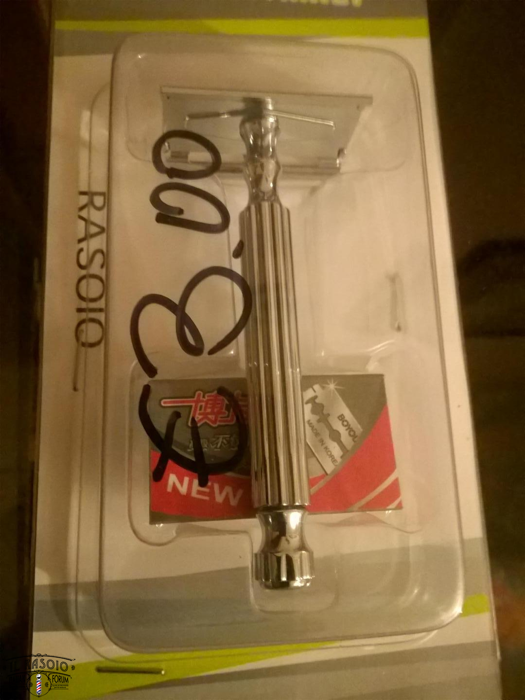 A differenza di altre immagini viste in rete dove il rasoio ha una suo astuccio plastico a guscio, la confezione da magazzinone cinese è piuttosto anonima, e buffa nella sua identificazione di una parte per il tutto; credo che anche la confezione possa essere mutevole. Occhio alla lametta ! :D