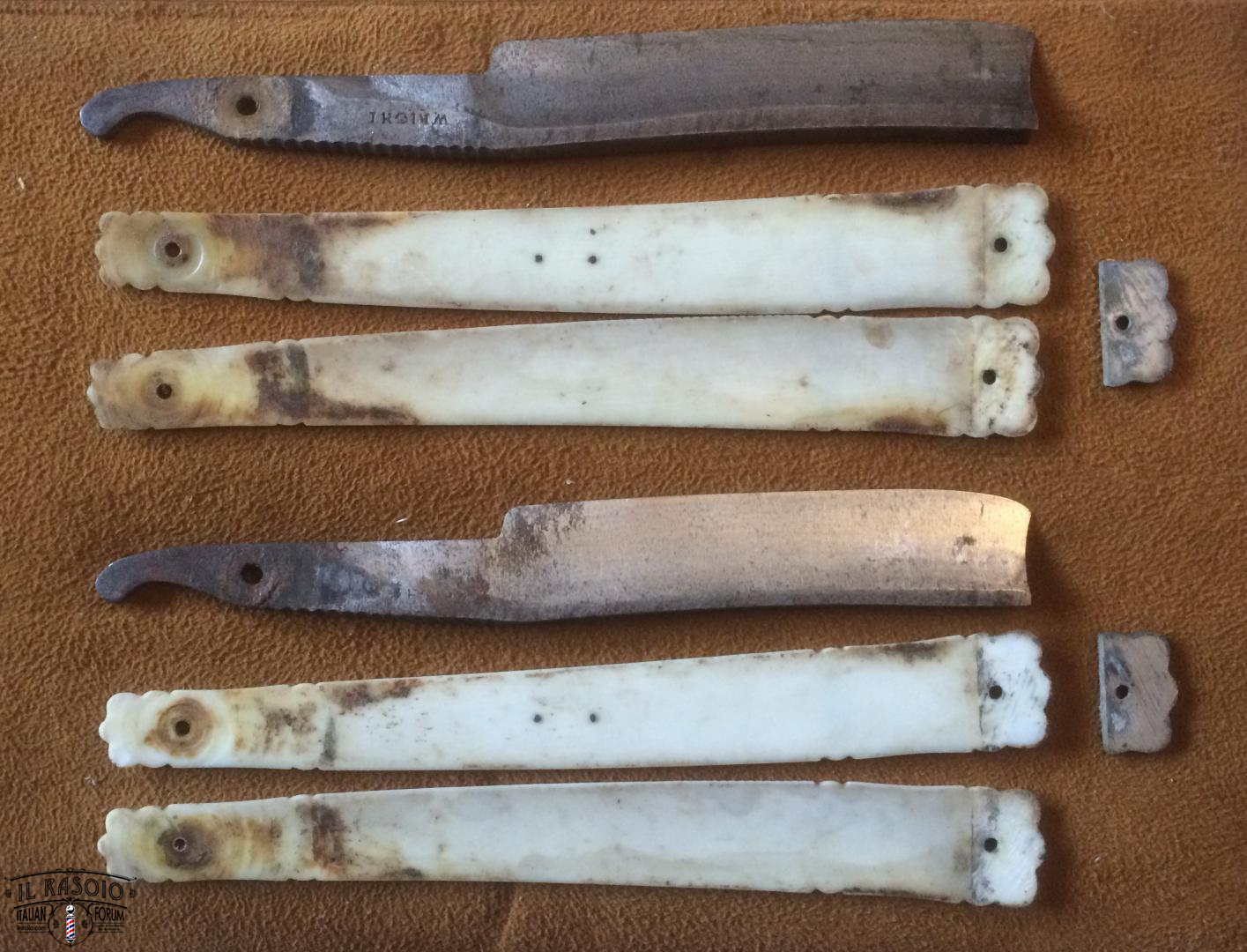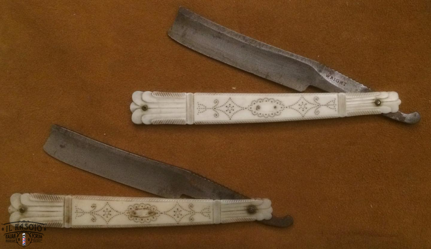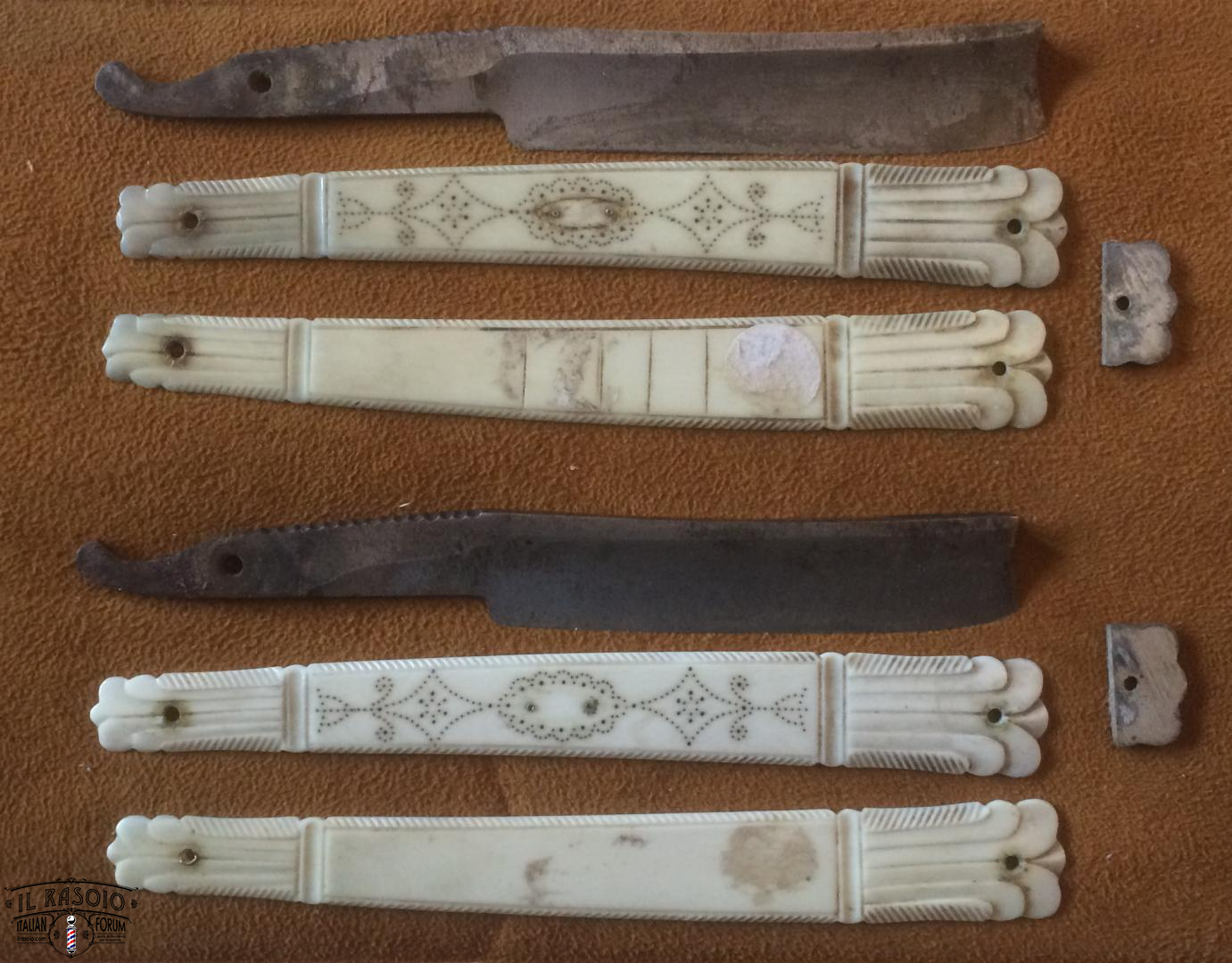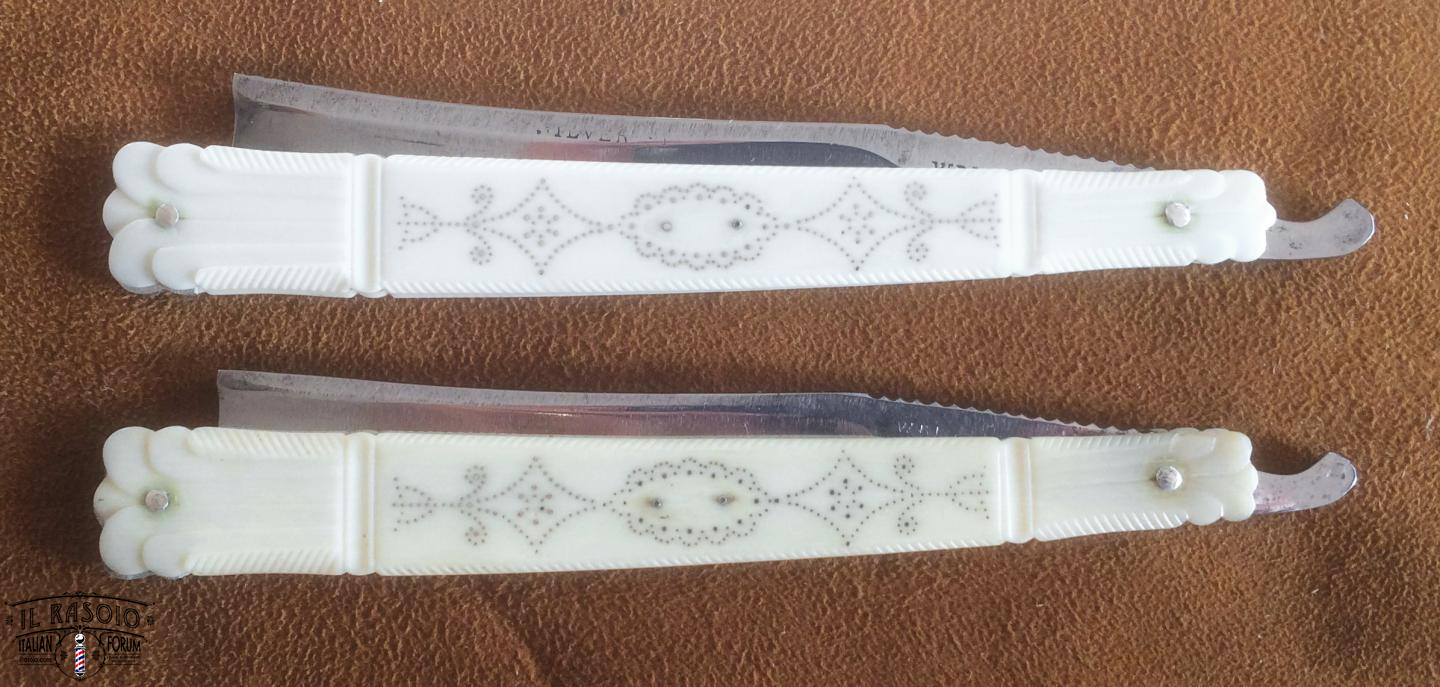 I due rasoi manicati in avorio e piquet work si presentano sostanzialmente in buone condizioni. Le lame mostrano segni di una leggera molatura (affilatura a mola? disossidazione a mola?) ma sostanzialmente rimangono dei near wedge da 6/8" con una lavorazione del codolo e della punta del dorso tipiche delle decadi del 1820-30 in area inglese. I pin invece a boccola con perno centrale sono in ottone e probabilmente posteriori dato che gli inglesi su questo tipo di manico montavano sempre dei perni in nickelsilver senza rondelle. Questo corrobora l'ipotesi di uno smontaggio professionale molto datato per una rimozione dell'ossido delle lame.