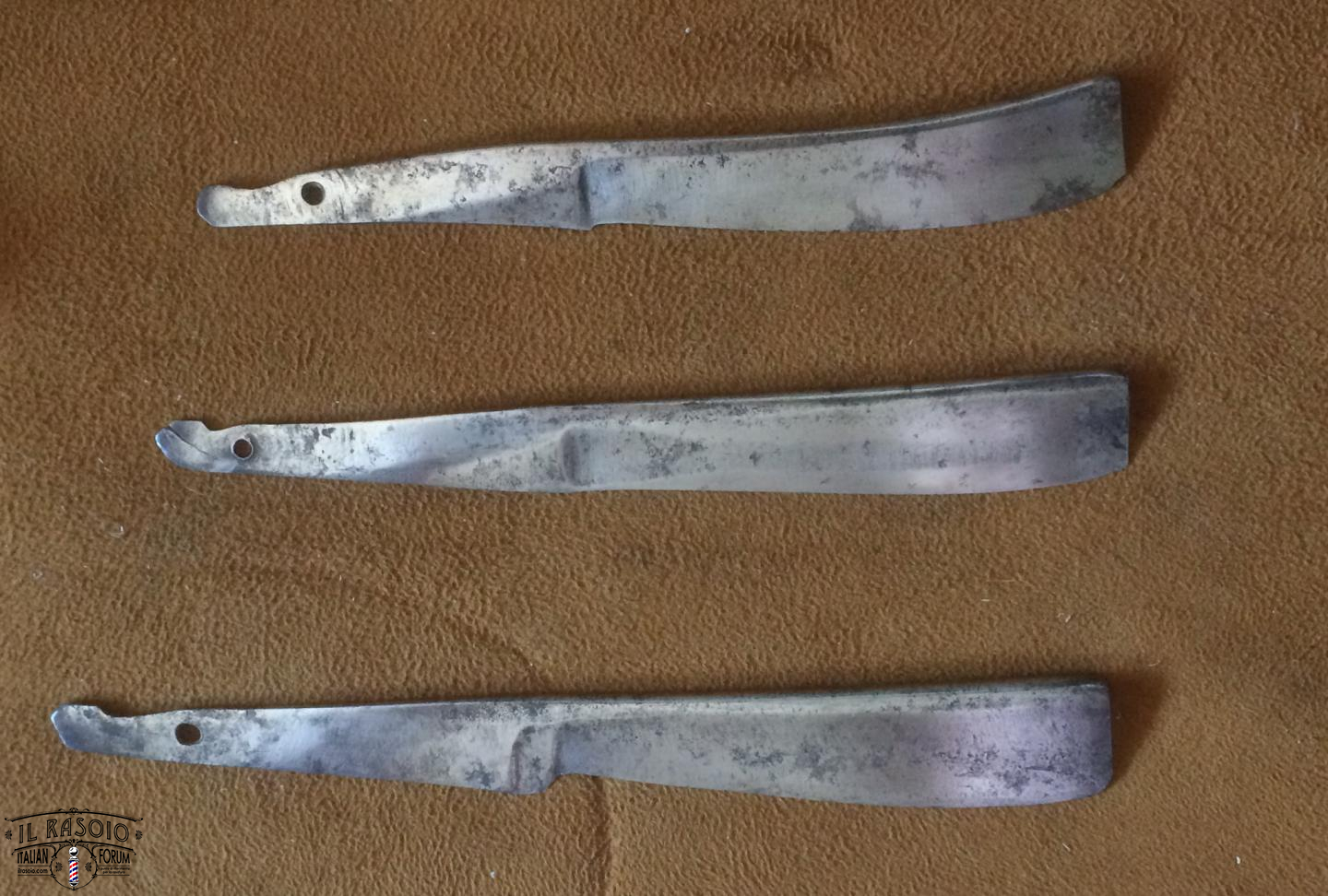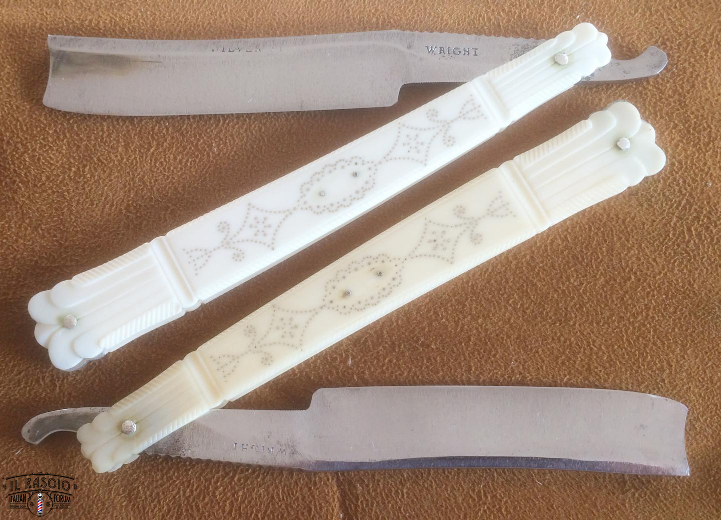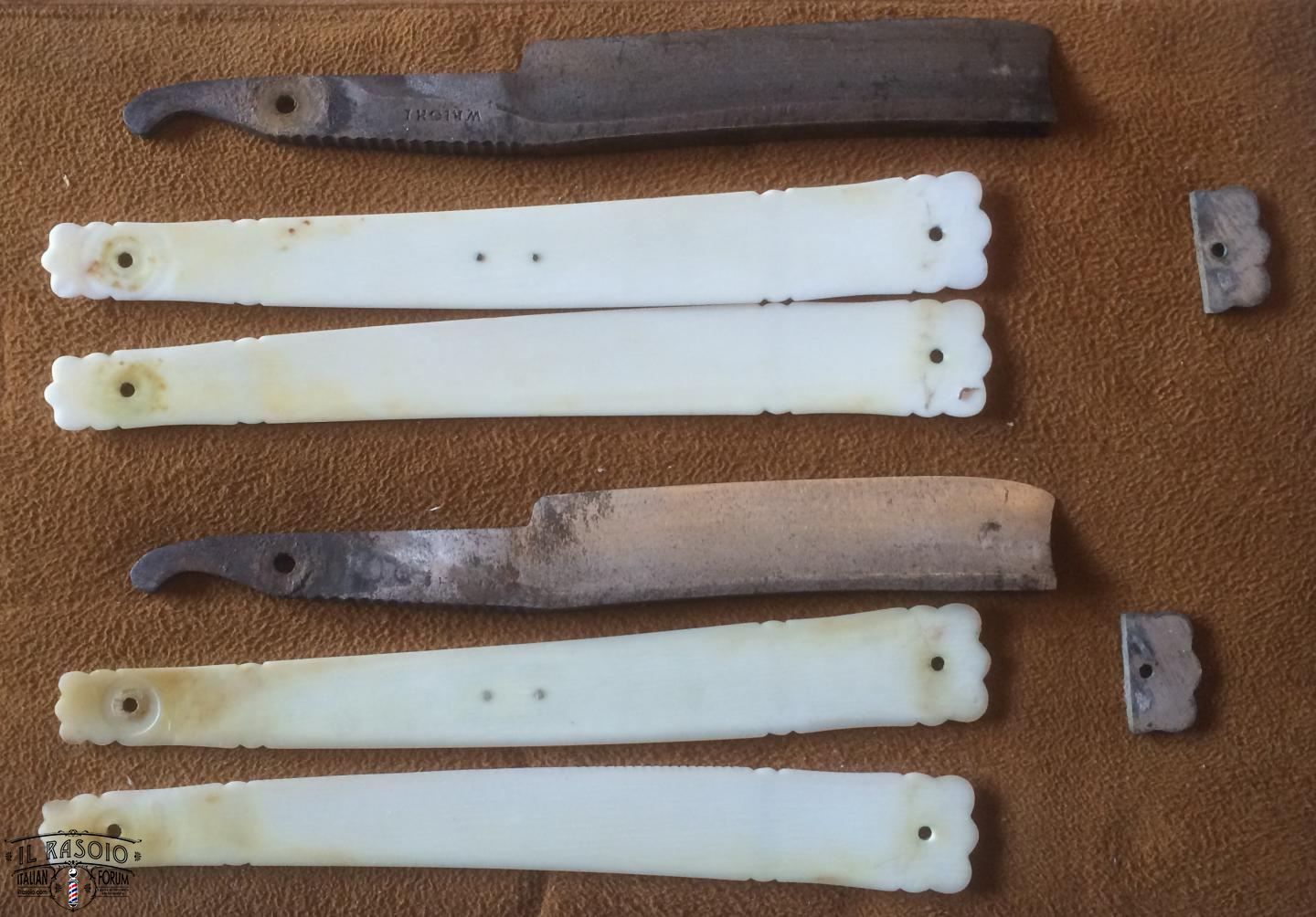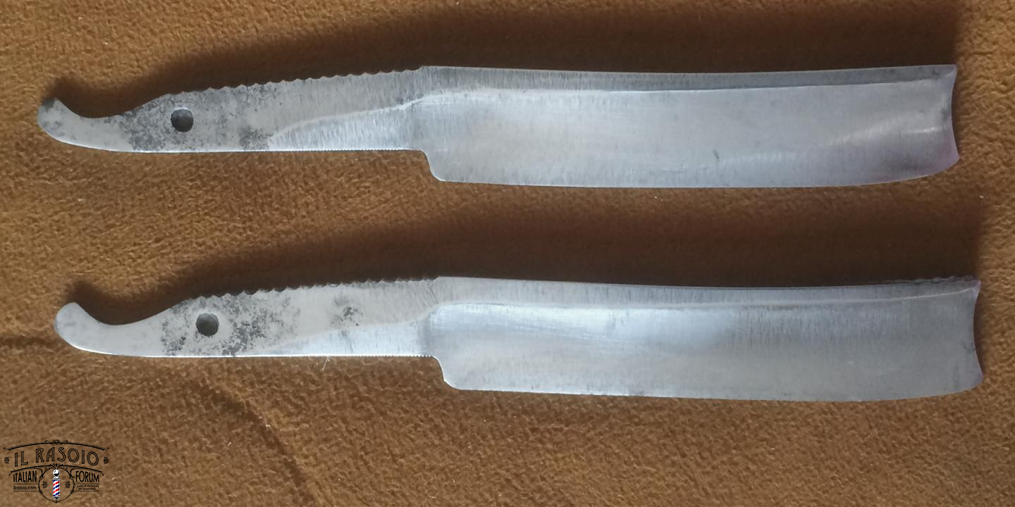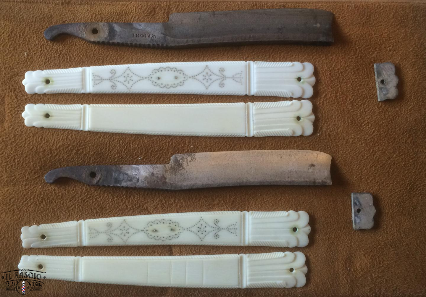 I due rasoi manicati in avorio e piquet work si presentano sostanzialmente in buone condizioni. Le lame mostrano segni di una leggera molatura (affilatura a mola? disossidazione a mola?) ma sostanzialmente rimangono dei near wedge da 6/8" con una lavorazione del codolo e della punta del dorso tipiche delle decadi del 1820-30 in area inglese. I pin invece a boccola con perno centrale sono in ottone e probabilmente posteriori dato che gli inglesi su questo tipo di manico montavano sempre dei perni in nickelsilver senza rondelle. Questo corrobora l'ipotesi di uno smontaggio professionale molto datato per una rimozione dell'ossido delle lame.