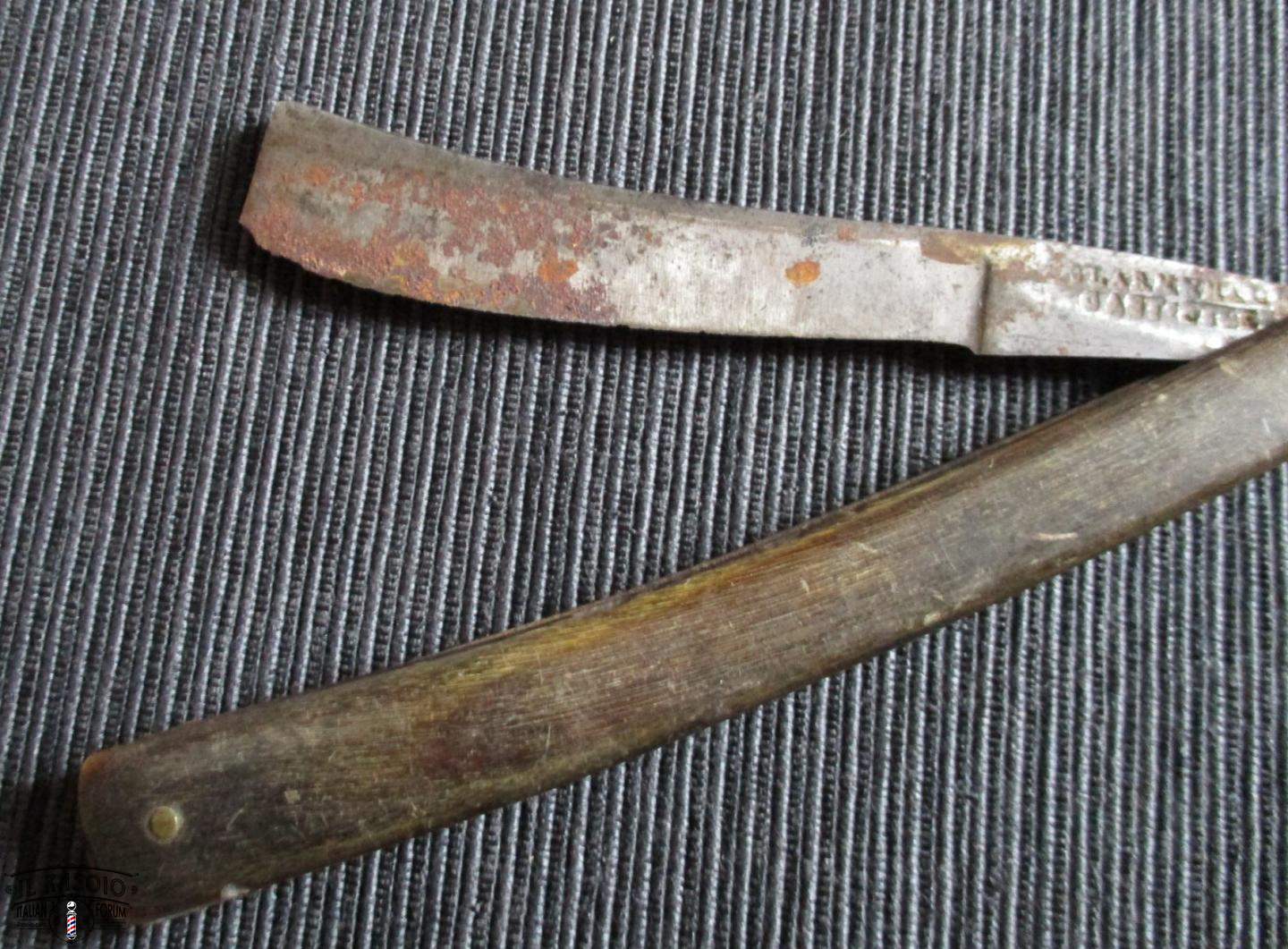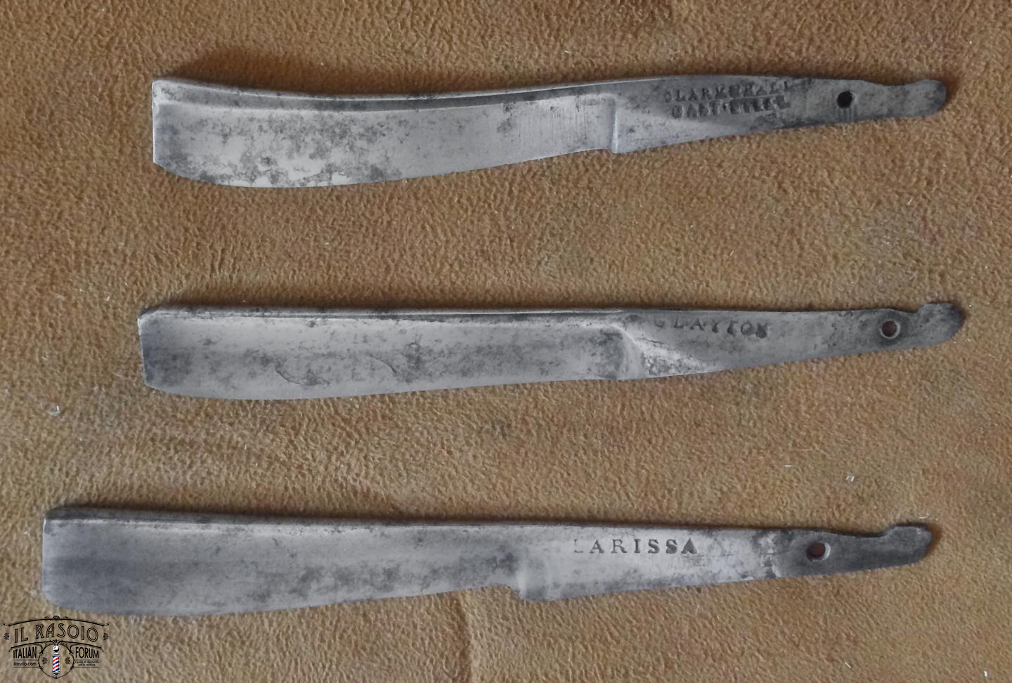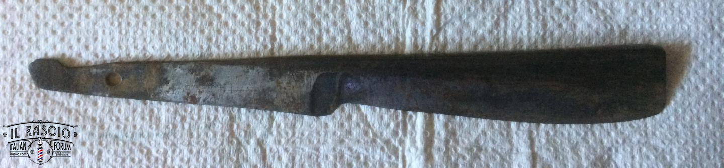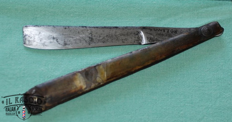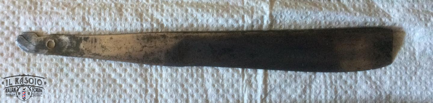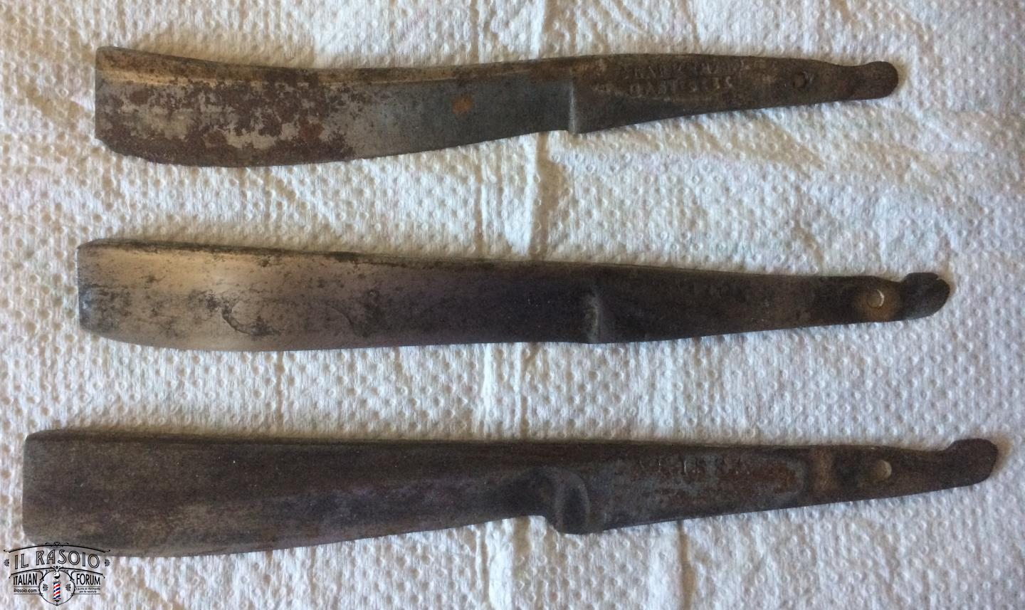 I due rasoi manicati in avorio e piquet work si presentano sostanzialmente in buone condizioni. Le lame mostrano segni di una leggera molatura (affilatura a mola? disossidazione a mola?) ma sostanzialmente rimangono dei near wedge da 6/8" con una lavorazione del codolo e della punta del dorso tipiche delle decadi del 1820-30 in area inglese. I pin invece a boccola con perno centrale sono in ottone e probabilmente posteriori dato che gli inglesi su questo tipo di manico montavano sempre dei perni in nickelsilver senza rondelle. Questo corrobora l'ipotesi di uno smontaggio professionale molto datato per una rimozione dell'ossido delle lame.