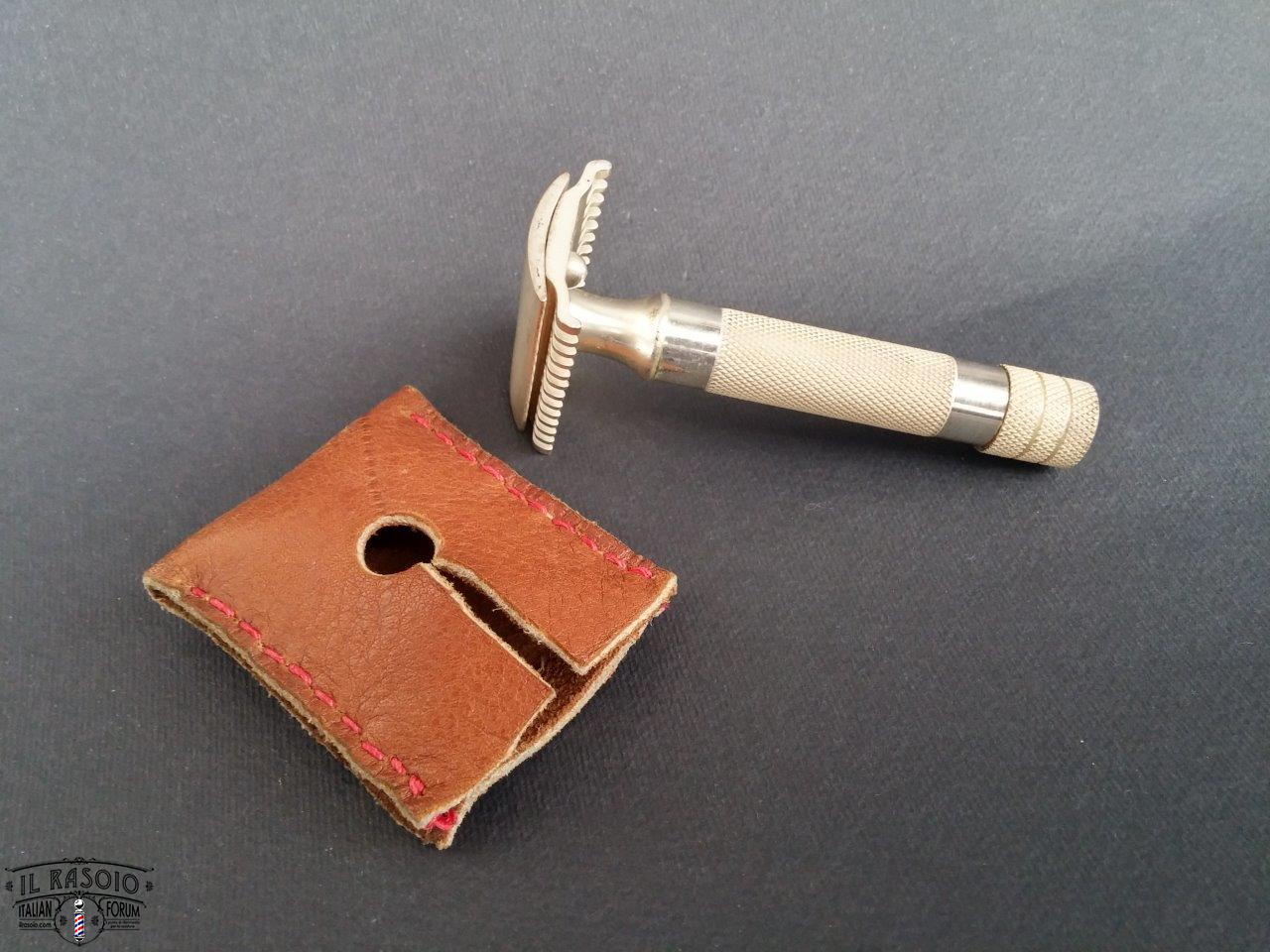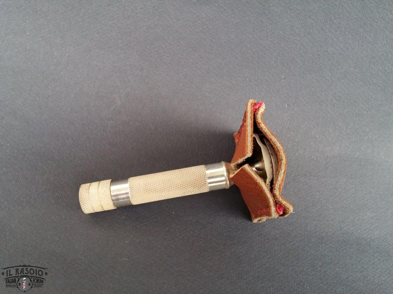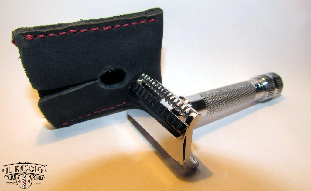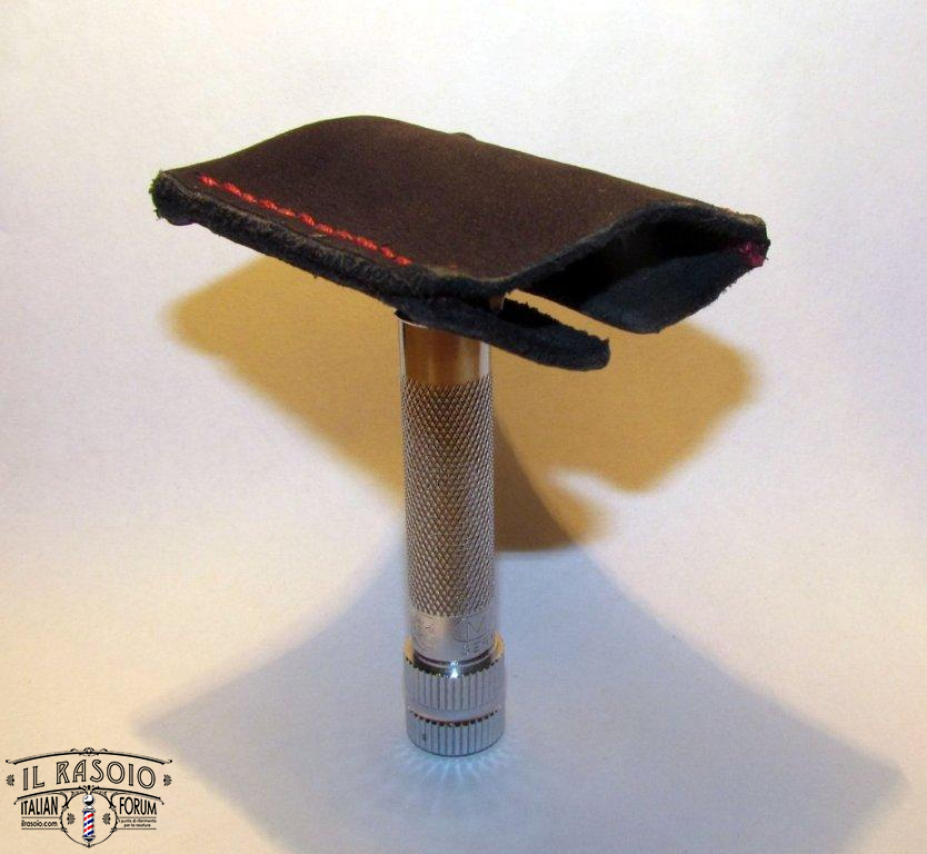 ho appena preso il Merkur 37c e siccome tengo i rasoi nel cassetto, anziché acquistare un porta rasoio ho voluto seguire le orme di Luca142857 provando a realizzare un copri testina con del cuoio morbido che avevo in casa.