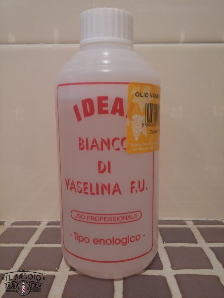 Ho escluso di usare l'olio di vaselina per i miei due rasoi con il manico in legno (sono quelli che in questo momento preferisco); se dovessi lubrificarne le lame lo farei con il gel di vaselina bianca F.U.,acquistabile in farmacia e confezionato in tubetti da 30 g.